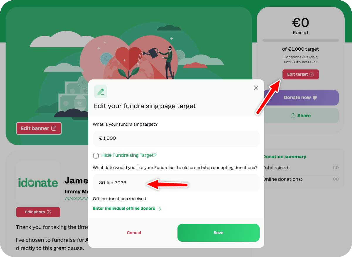 You can change the closing date at any stage. After this date, your page will remain visible but it won’t be possible to donate to your fundraiser.