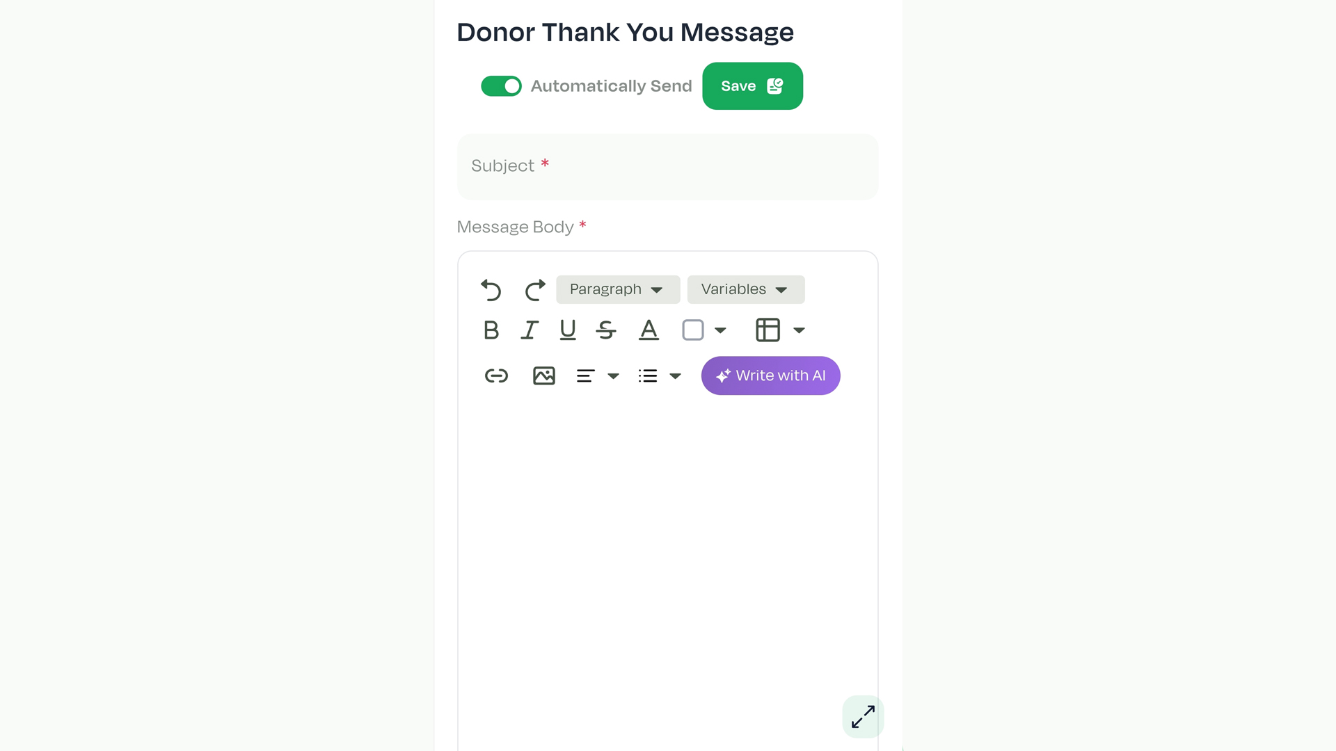 - Enter a subject and the message that you wish to be sent to all new donors